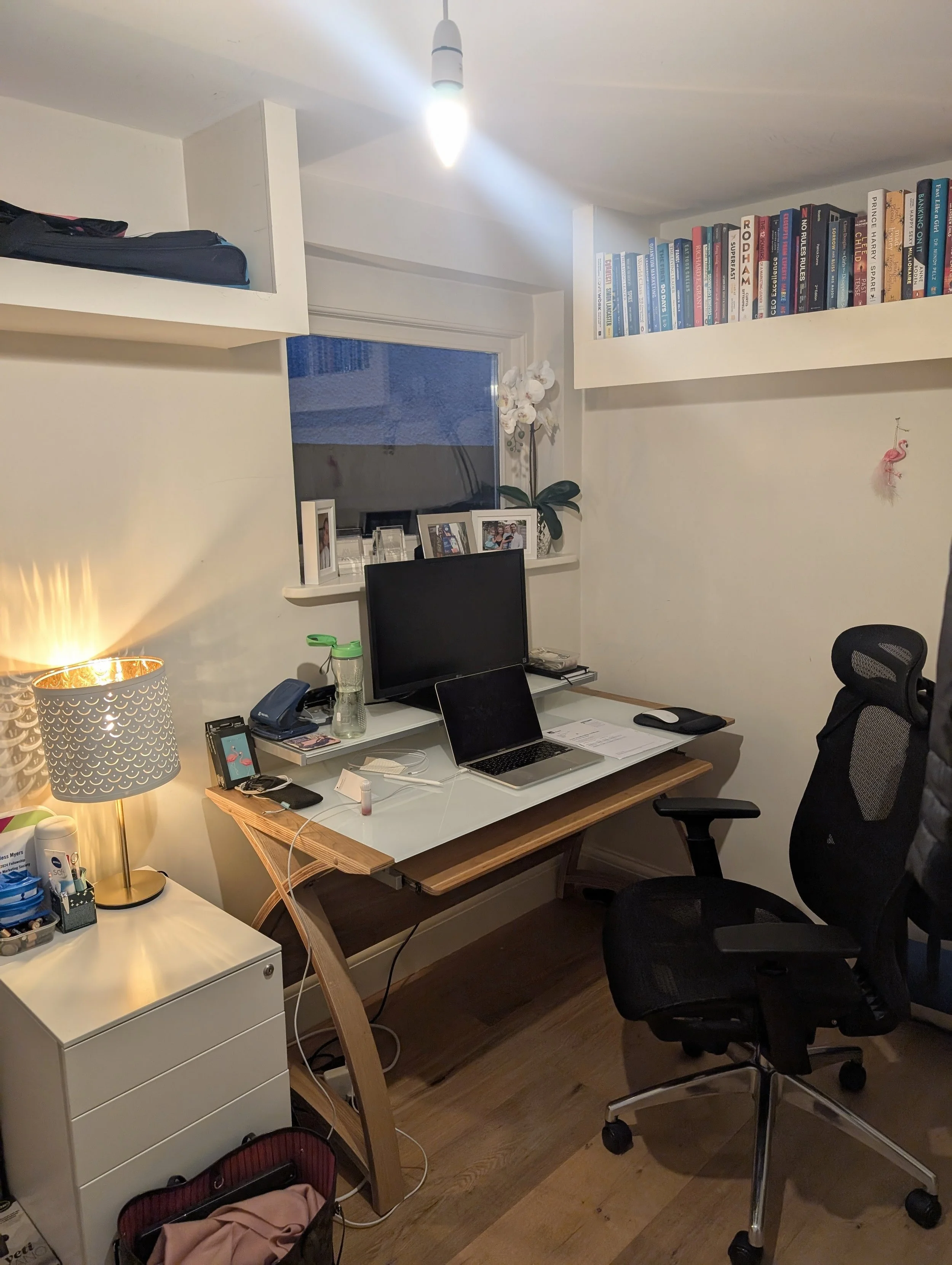 One of the standout features is the curved solid walnut desk, which we designed specifically to soften the lines of the room and improve movement in the tight space. Not only is it a striking design detail, but the shape also adds visual fluidity and maximises the usable surface without feeling bulky or rigid.